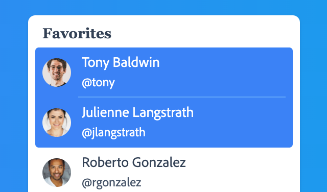 toggleandreplaceselection behaviors. - Keyboard navigation – List items can be navigated using the arrow keys, along with page up/down, home/end, etc. Typeahead, auto scrolling, and selection modifier keys are supported as well.