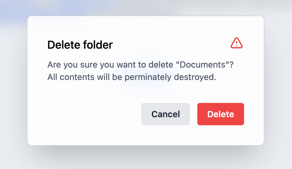 dialogoralertdialogwith ARIA. The dialog is labeled by its title element, and content outside the dialog is hidden from assistive technologies while it is open. - Focus management – Focus is moved into the dialog on mount, and restored to the trigger element on unmount. While open, focus is contained within the dialog, preventing the user from tabbing outside.